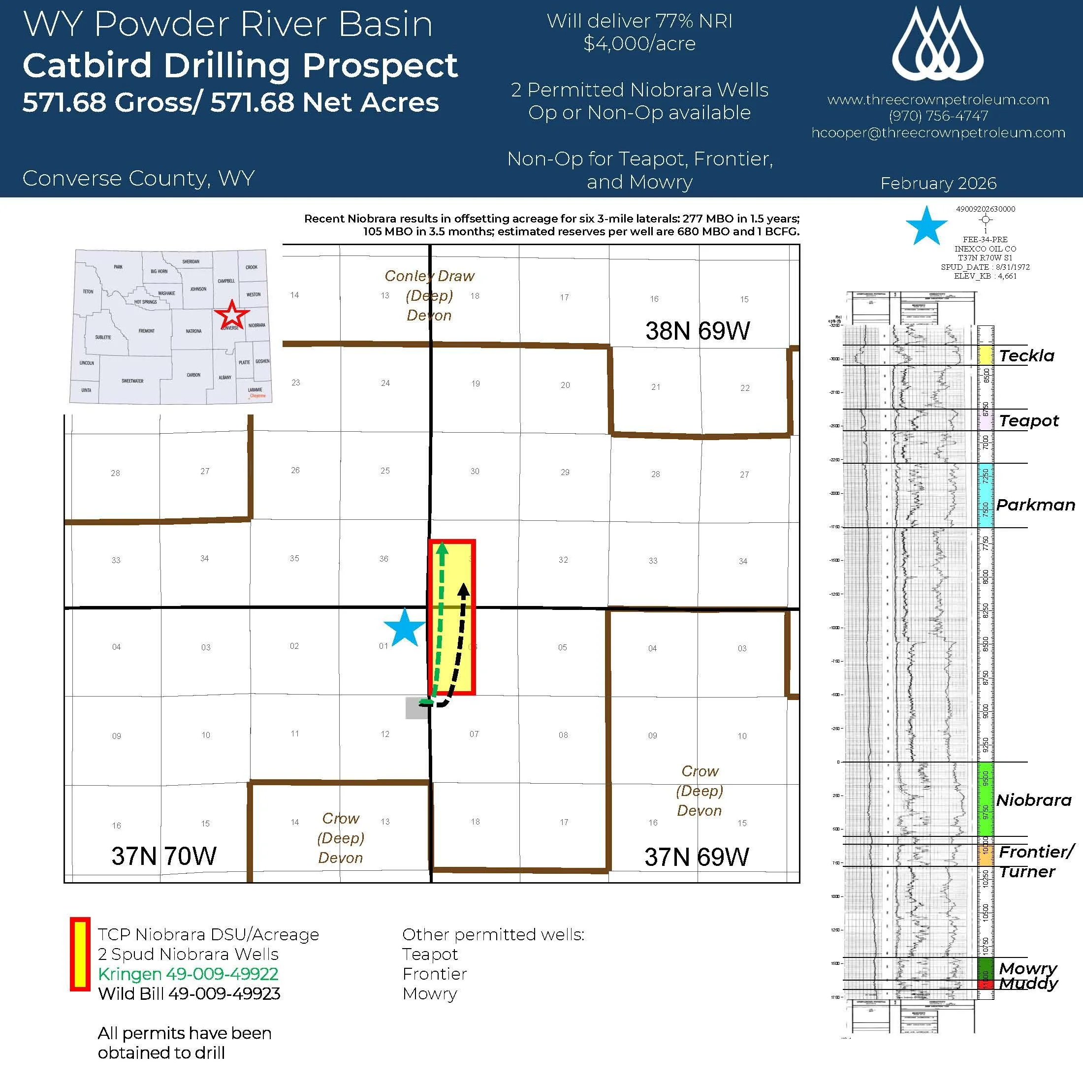 The Catbird Drilling Prospect is a 571.68 gross / net acre lease package for sale in the Southern Powder River Basin in Converse County, Wyoming. Our acreage is between a large amount of acreage that has been bought from Anadarko by Occidental, and sold to Anschutz by Occidental. The 571.68 net acre lease package is in a DSU that TCP has 2 permitted Niobrara wells. Interest can be bought as Op or Non-Op for the Niobrara formation, and Non-Op for the Teapot, Frontier, and Mowry formations. TCP is selling the interest at $4,000/net acre and will deliver a 77% NRI We are happy to provide you with any further details of the lease agreements, and for any questions hit the contact us button below.