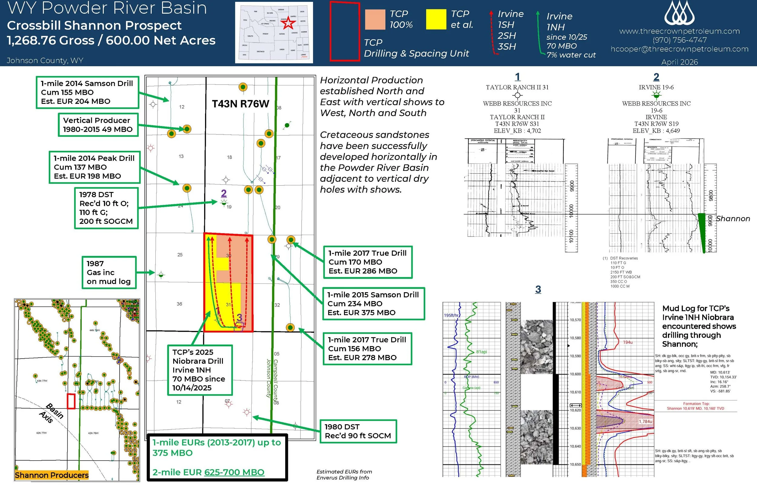 The Crossbill Prospect, is a Shannon well horizontal project, located in a Drilling Spacing Unit covering 1,268.76 gross and 600.00 net acres in the Powder River Basin in Johnson County, Wyoming. The well pad and facilities have been built, and the Irvine 1NH well is currently producing. Three Crown Petroleum is selling working interest in the Crossbill Prospect, that can be bought as Op or Non-Op.