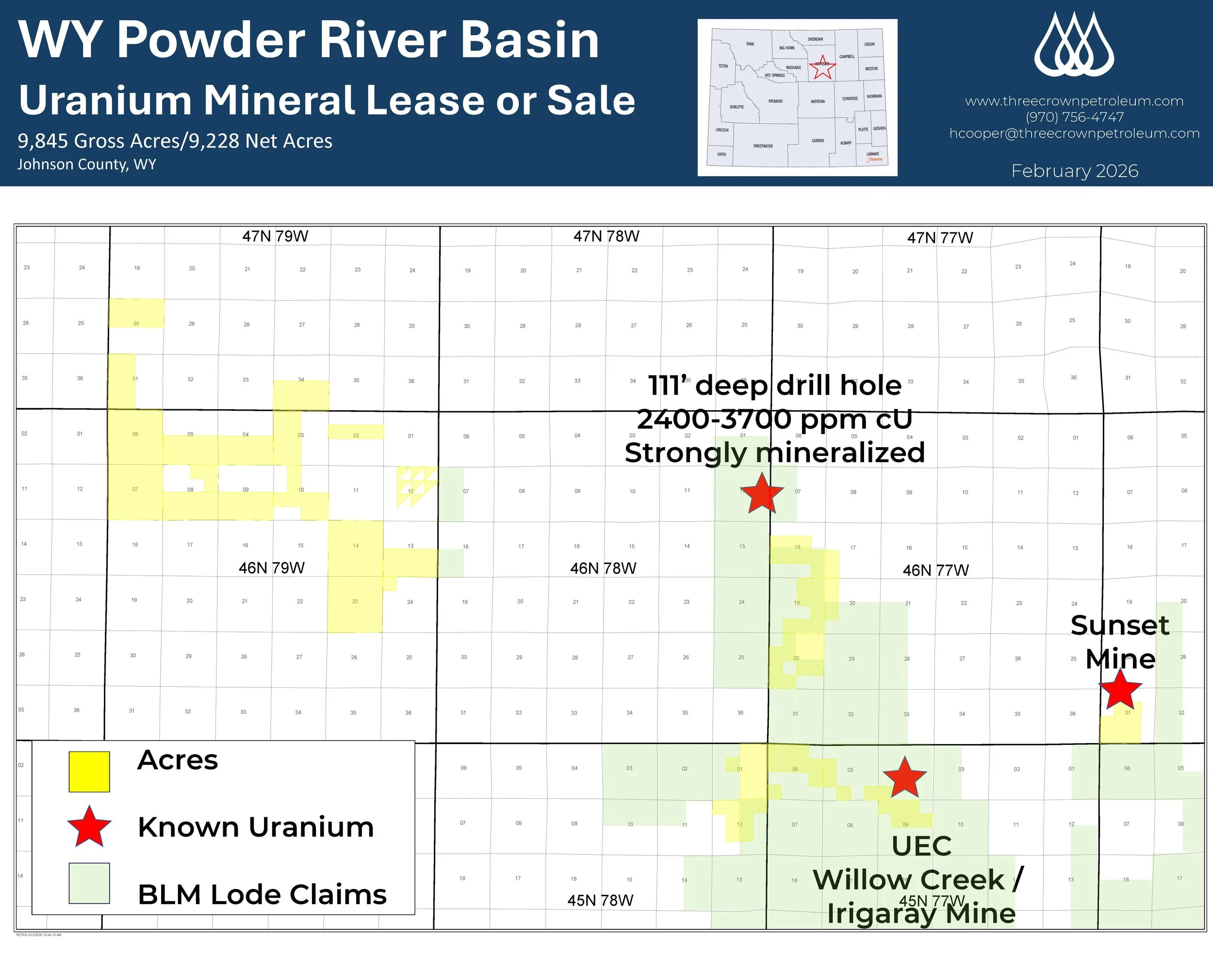 The Powder River Basin Uranium Sale is a large mineral package for sale or lease in the western-central Powder River Basin (PRB) of Wyoming covering 9,228 net acres under 9,845 gross acres. The map to the right is an overview of the area. Nearby mines and BLM Lode claims establish the uranium supply in the area.